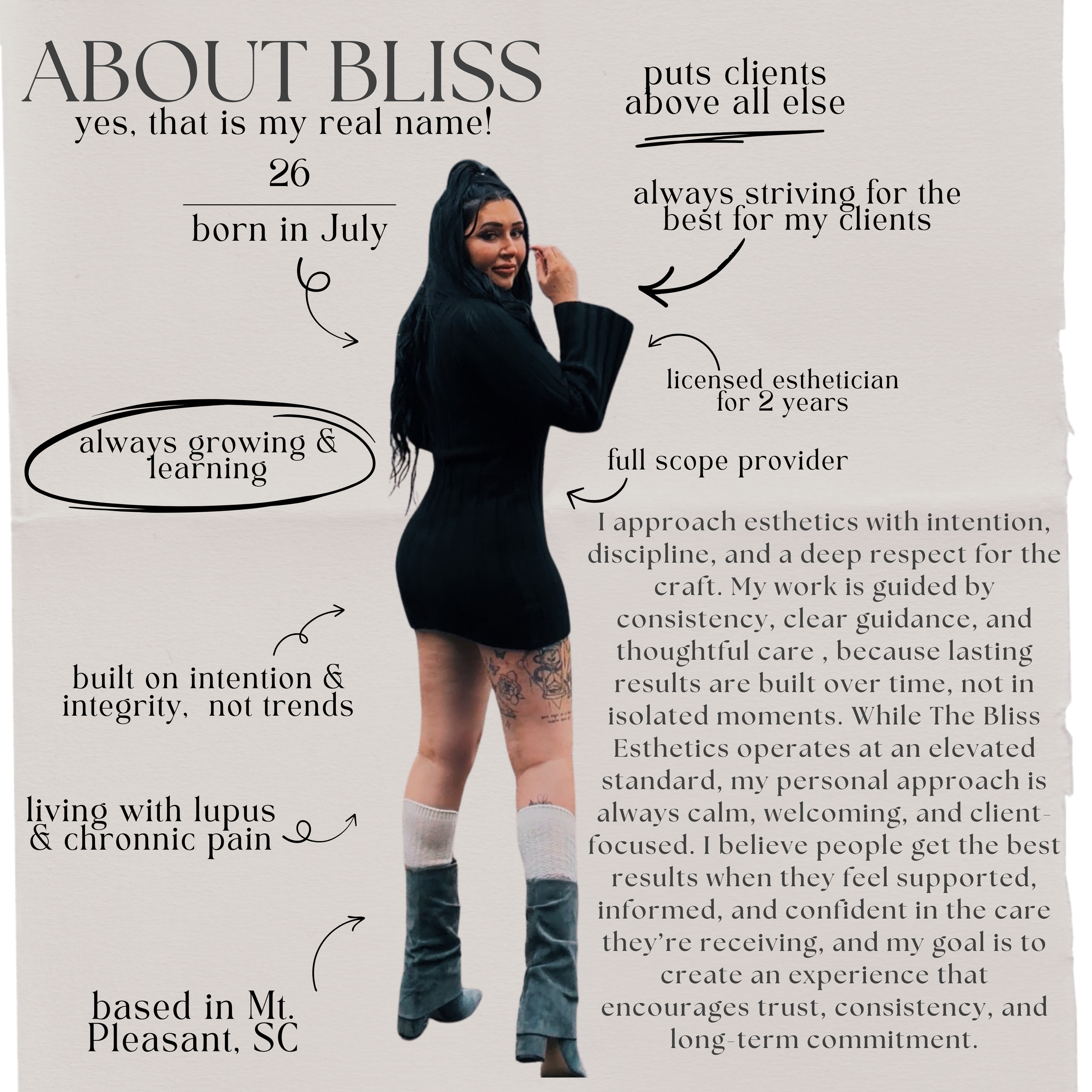Bliss’s journey into esthetics was guided by a desire to create something meaningful - a career rooted in purpose, growth, and care.